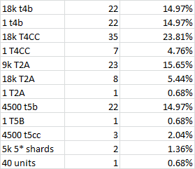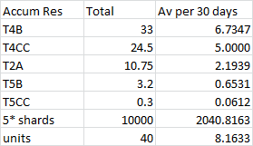 Overall, it is not a bad bunch of stuff. About seven T4B and five T4CC a month for free. The two T2A per month is also pretty good. 6% of a T5CC is also pretty good for free given how much you get from things like EQ, although that reward is sufficiently rare that there's not enough data to know what the long term average is. Ditto 5* shards and units, and of course 6* shards.