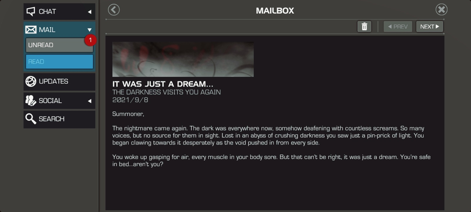 The picture is pretty much the same except there are black wisps at the bottom. The 2nd red symbol now also appears at the bottom of the image in white and is much more clear. Perhaps it was to help with last week's clue? I have a feeling the bottom part of the image has been cut off. Next week's clue could help out there. The summoner continues to have nightmares.