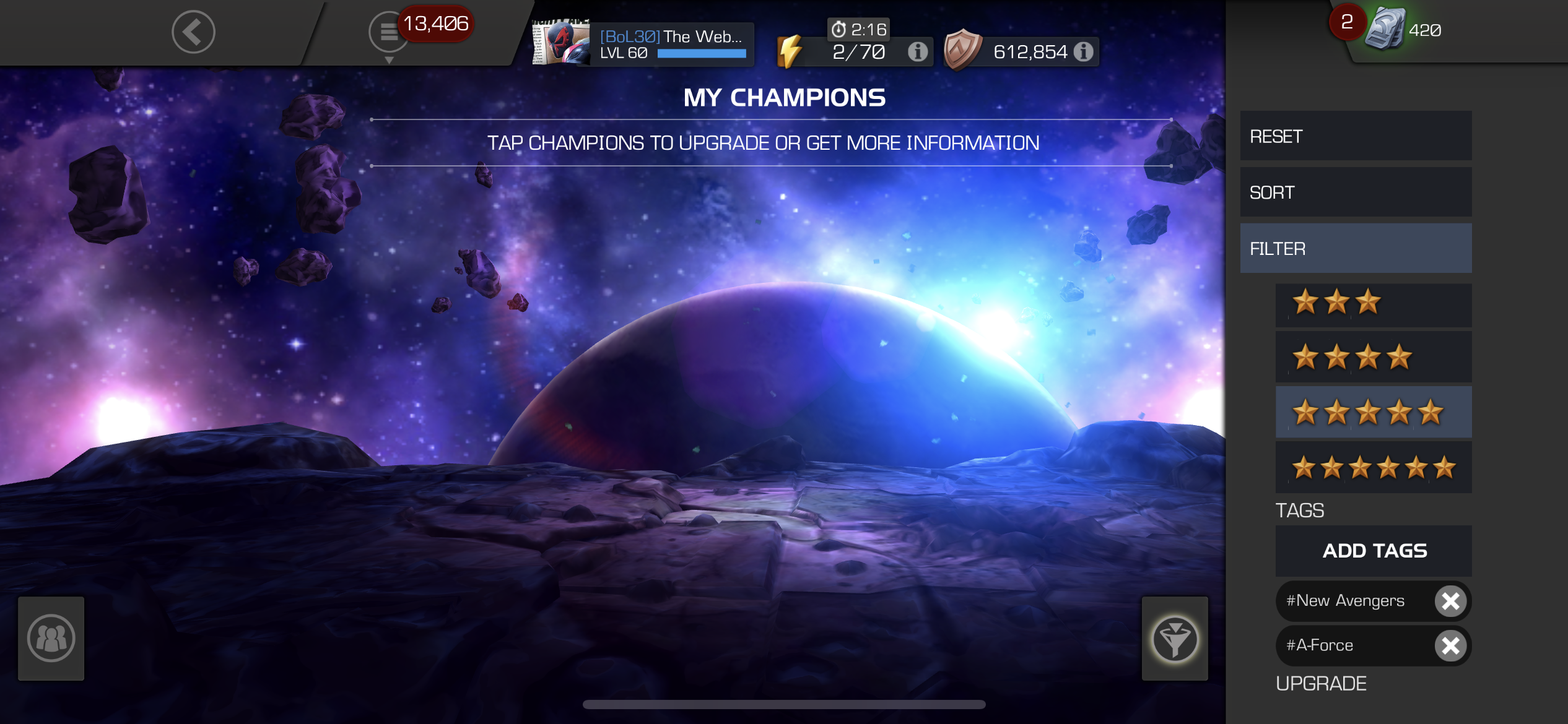 With the current setup for monthly Cavalier Quest and future gameplay designs these are my recommendations to improve the Add Tags in the Filter for Champions:1st: Switch the operator currently being used from "AND" to "OR" allowing the user to see all the champs options from two Organization selections.