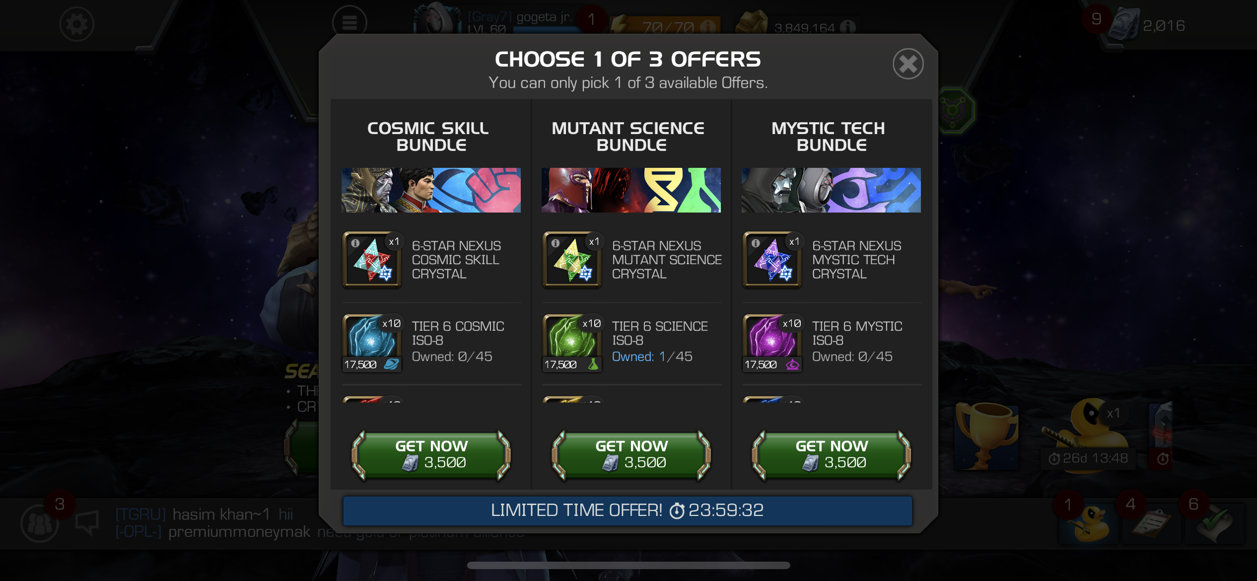 So as I opened the game today saw this new offer where there are different variety of dual crystals from the ones available in the shard crystals. I’ve been hoping that kabam makes some changes to the dual crystals, my suggestion previously was to let the person selecting the crystal ,select the two classes he/she wants the champ from so as to optimise champ hunt. But i think this won’t be too bad either! I like the combos of skill-cosmic, tech-mystic and science-mutant! awhile back i made a post about having too many skills and cosmics and a very few mystics and tech! I feel many players are in the same boat and if kabam implements this change it will really help summoners hunt a certain class efficiently!
