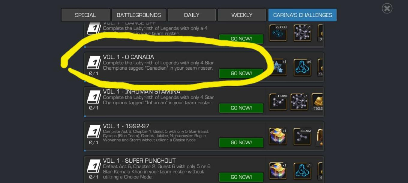I've been scrolling through the Carina's challenges and found the one where you need to complete labyrinth with champions tagged "Canadians".