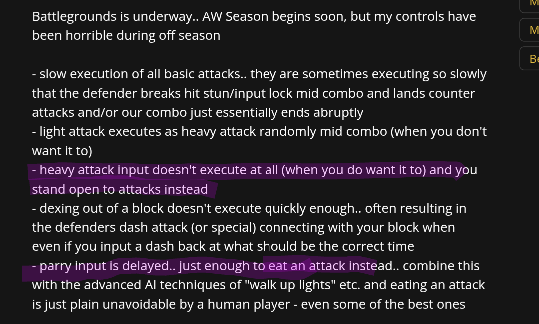 - slow execution of all basic attacks.. they are sometimes executing so slowly that the defender breaks hit stun/input lock mid combo and lands counter attacks and/or our combo just essentially ends abruptly