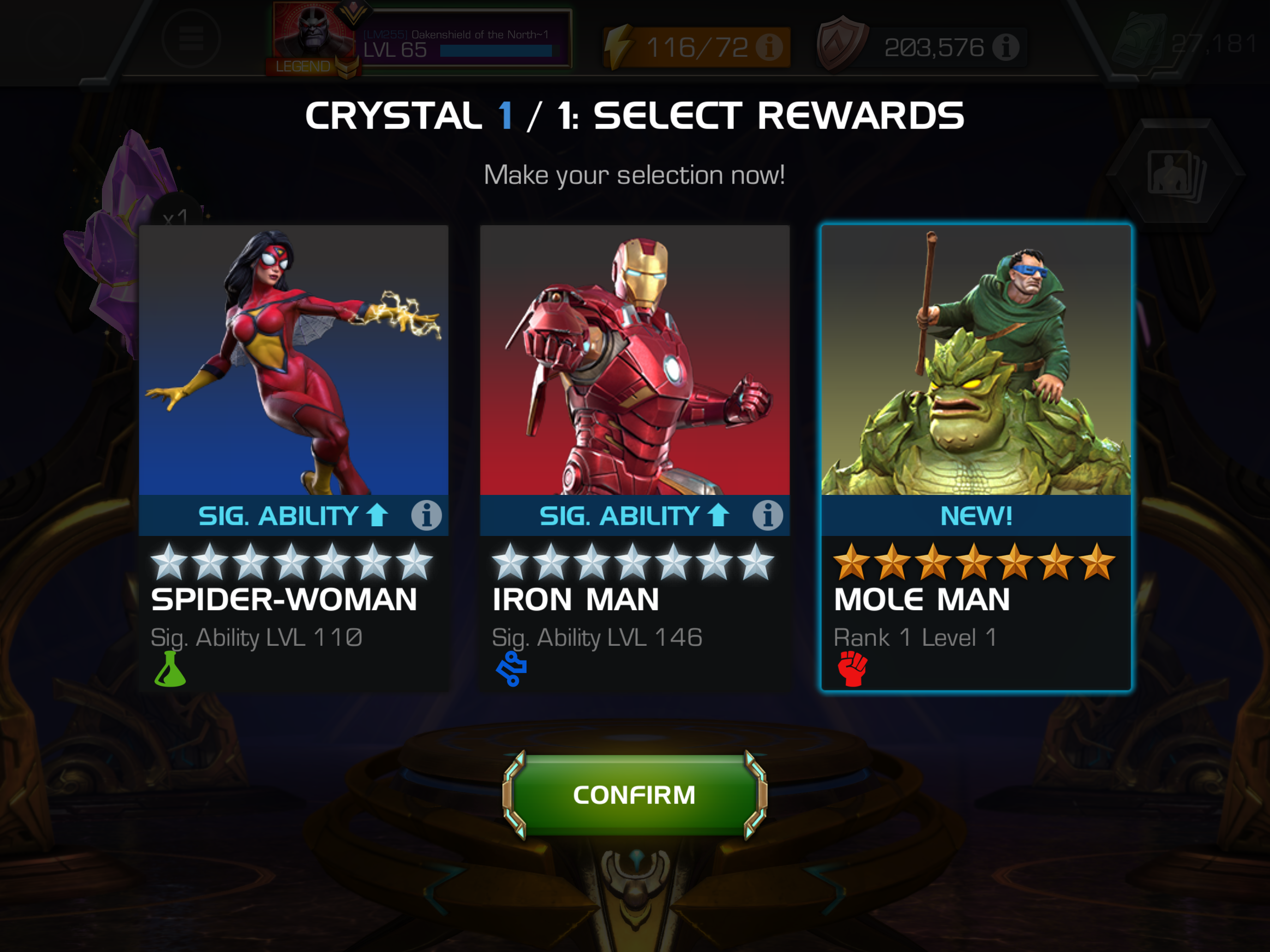 Objectively I think Abs Man is the better of the two, but based on my current roster needs I’ll probably go for Kingpin. I’ve not been able to pull MoleMan so I don’t have a good shrug champ. I also have R4 Hood and the two of them are a great pairing. I don’t really care for Valkyrie, and finally, my Skill roster is my weakest.