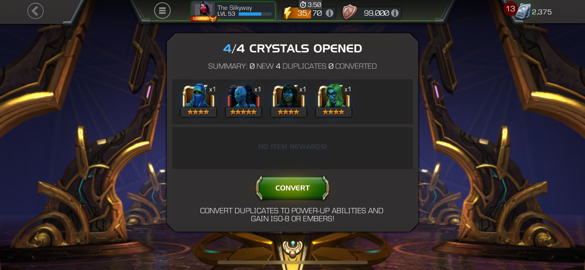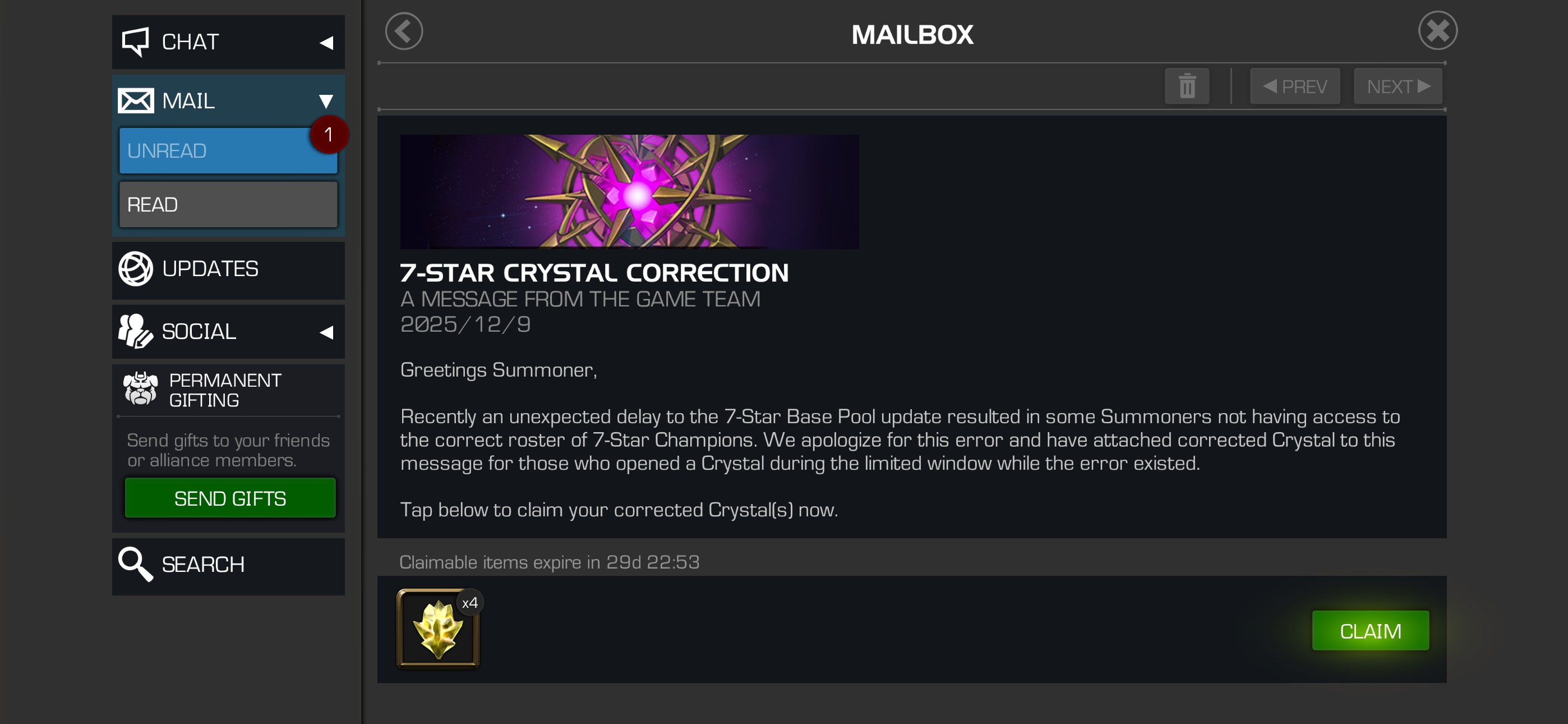 For anyone who didn't open or didnt open their entire stash, would be at a huge disadvantage compared to those that did. The base pool of 7*'s is more diluted with champs than public pools are with chlorine and urine, so getting a 2nd chance for multiple crystals is basically like getting handed down a selector for champs someones missing.
