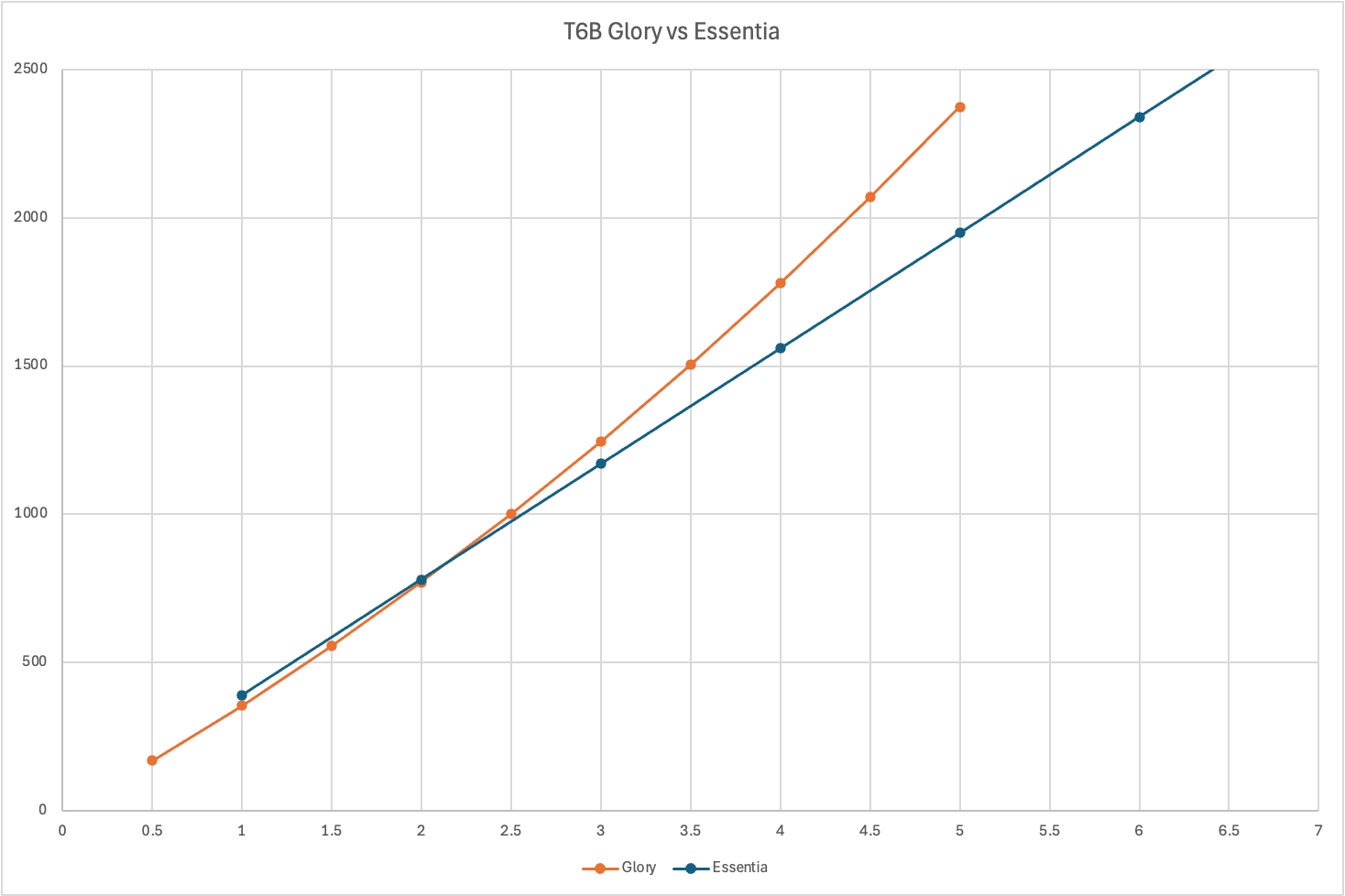 So at a glance, it looks like the Essentia store is a complete bust. But the Glory store prices rise rapidly: for each additional 8200 fragments the price in Glory went up by 150. So the next one was 650, then 800, and so on. How does the Glory prices compare to Essentia as the amounts we buy increase? Here's a chart visualizing the difference: