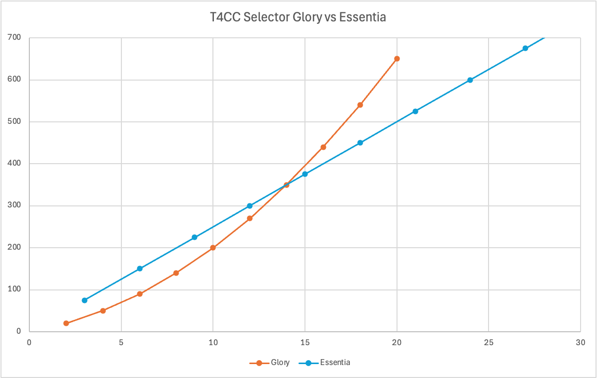 Here we see that the Glory store pricing is actually significantly better until you reach the break even point of about 14 total catalysts, where Essentia pricing then gets significantly better than Glory pricing. 14 sounds like a lot, but given how T4CC is used in rank ups, anyone needing T4CC probably needs them in bunches: 14 is not a lot spread out across six classes of catalysts. Here I would say if you were only buying a couple here and there to top off your collection the Glory store was better, but if you're cranking these out to make significant lower rarity rank ups then the Essentia store is going to be better. And of course if you need a lot of them: