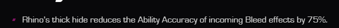 Idk when they did this but why did they change rhinos in game wording to fit how it works instead of change how it works to fit the wording? In his spotlight it says "reduces the ability accuracy of incoming bleeds by 75%" but was changed in game to be "reduces the opponents bleed ability accuracy by 75%". The main problem with the way it worded with the original wording was when using sinister, which a lot of people have tried, and noticeably said something was wrong with the wording for how it was actually working. I don't know which was the actual intended effect and whether or not they were just too lazy to properly fix the way it works.
