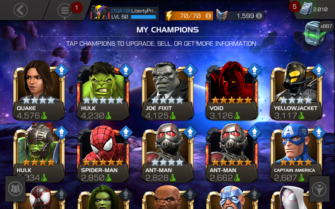 So... Gotta lot of choices here... I've got a 4 Star Science Awakening Gem to use, should I use it on Hulk Ragnarok or SpiderGwen. And out of everyone who should I Rank 5/Rank 3? I know Hulk Ragnarok is useful even as a 4 Star late game to deal with Passive Damaging Effects, SpiderGwen and SheHulk are about to be Buffed (didn't get to try them myself, thanks buggy beta servers, but I've seen all the insane gameplay), Quake is an absolute Goddess when you know how to play her (which I do), Hulk's a great Stun Locker and gets better Damage the lower he gets (he's been duped twice), Void I already have as a near completely maxed 4 Star and while I really do need Utility in a 5 Star he uses Debuffs for it and my other 5 Stars are already Debuff/Buff Heavy, and no I don't have Ghost or Wasp for the Quantum Trinity so I'm not bothering with Antman for now...